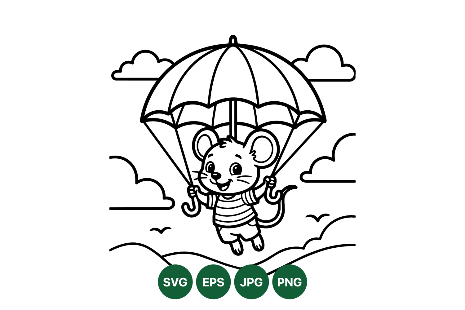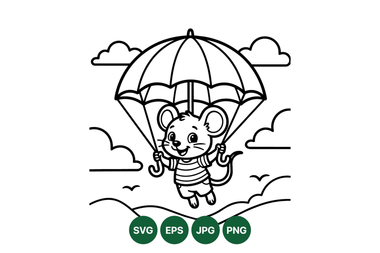 Cute Mouse Illustration Playful Animal Graphic Parachute Cartoon Design Kids Vector Drawing Fun Childrens Artwork Sky Adventure Image Happy Character Art Outline Clipart Vector Whimsical Animal Picture Floating Parachute Graphic