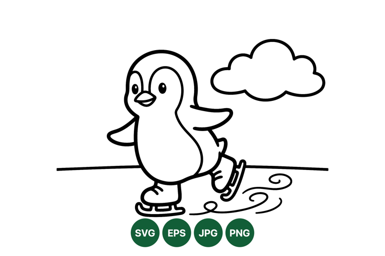 A charming penguin figure glides on ice skates with a swirling trail and a single cloud overhead in minimal black and white line style playful and fun