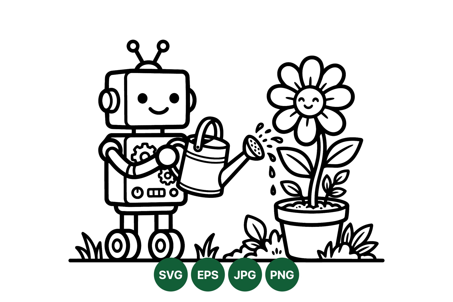 A charming robot waters a happy blooming flower in a pot surrounded by leaves and grass in a simple black and white line style vector suitable for coloring and education.