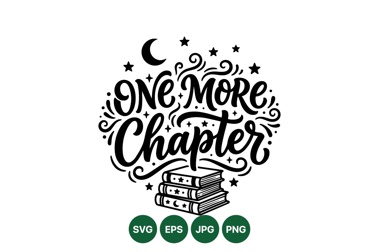 Decorative hand lettering displaying the phrase one more chapter surrounded by stars crescent moon and a stack of books in monochrome style ideal for literary and reading themes peaceful