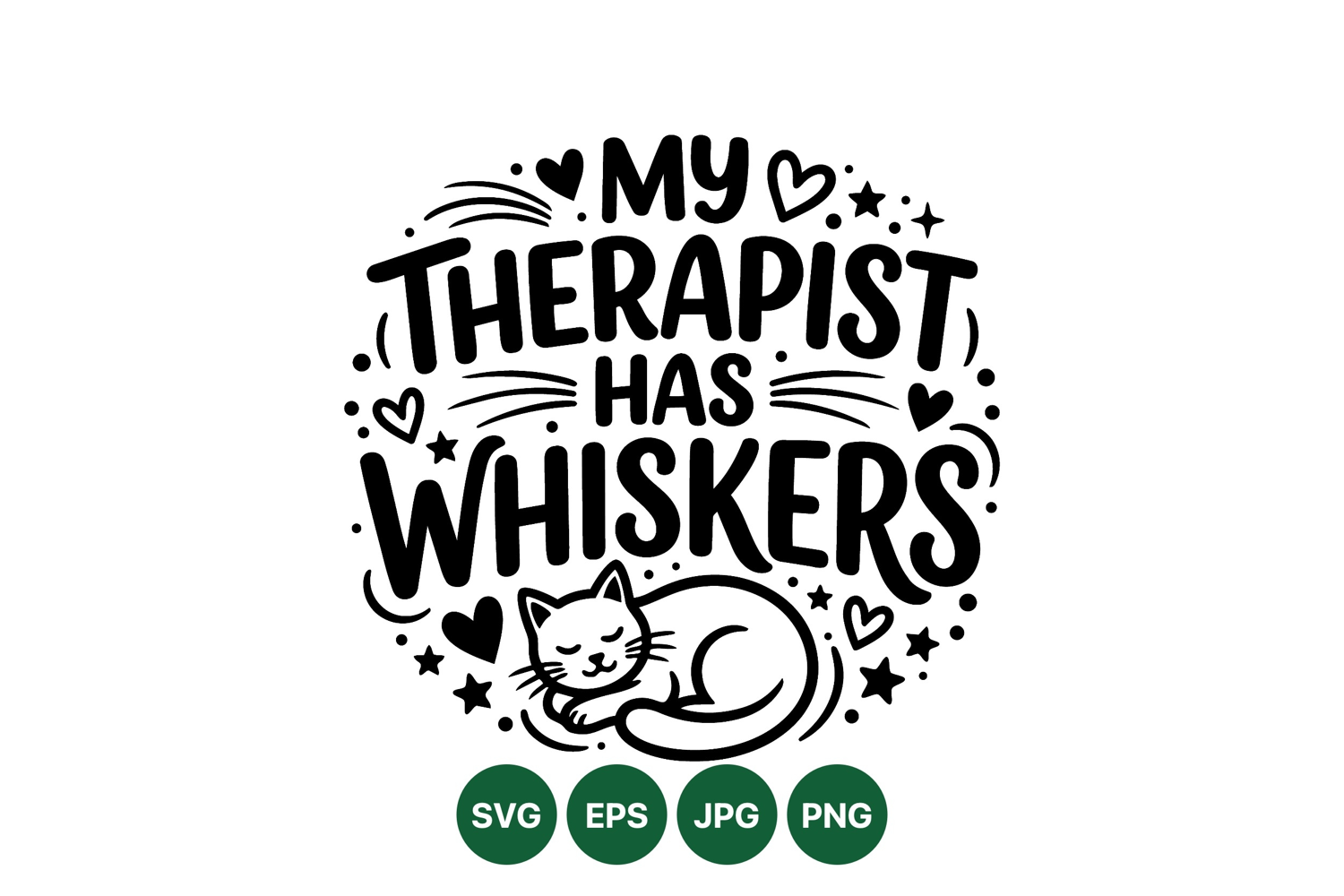 Hand drawn playful typography saying my therapist has whiskers surrounded by decorative hearts stars and a sleeping cat illustration in black and white style peaceful