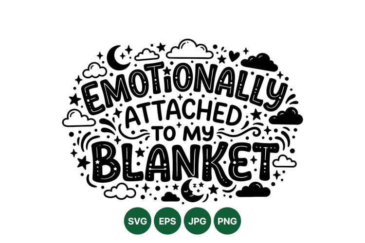 Playful hand lettered phrase emotionally attached to my blanket embellished with stars clouds and crescent moons in black and white style suitable for cozy apparel or print