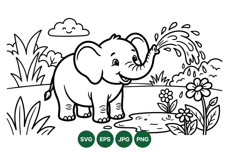 Black And White Art Baby Elephant Clipart Cute Animal Svg Nature Scene Svg Children Coloring Page Cartoon Animal Graphic Outline Vector Art Kids Coloring Design Playful Animal Drawing Water Flower Illustration