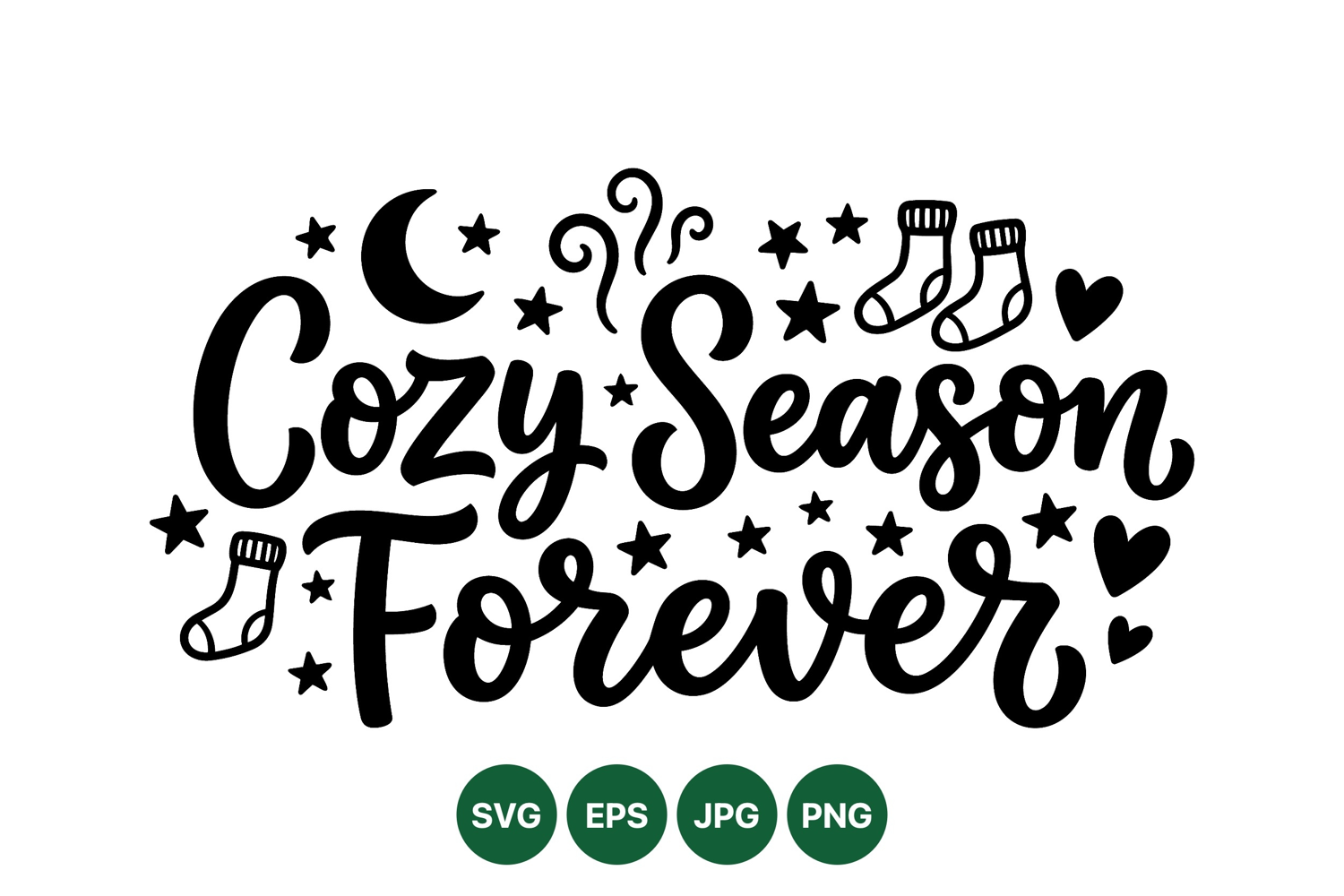 Elegant hand lettering of cozy season forever phrase surrounded by moon stars socks and hearts in black and white style suitable for seasonal designs and winter greeting cards peaceful mood