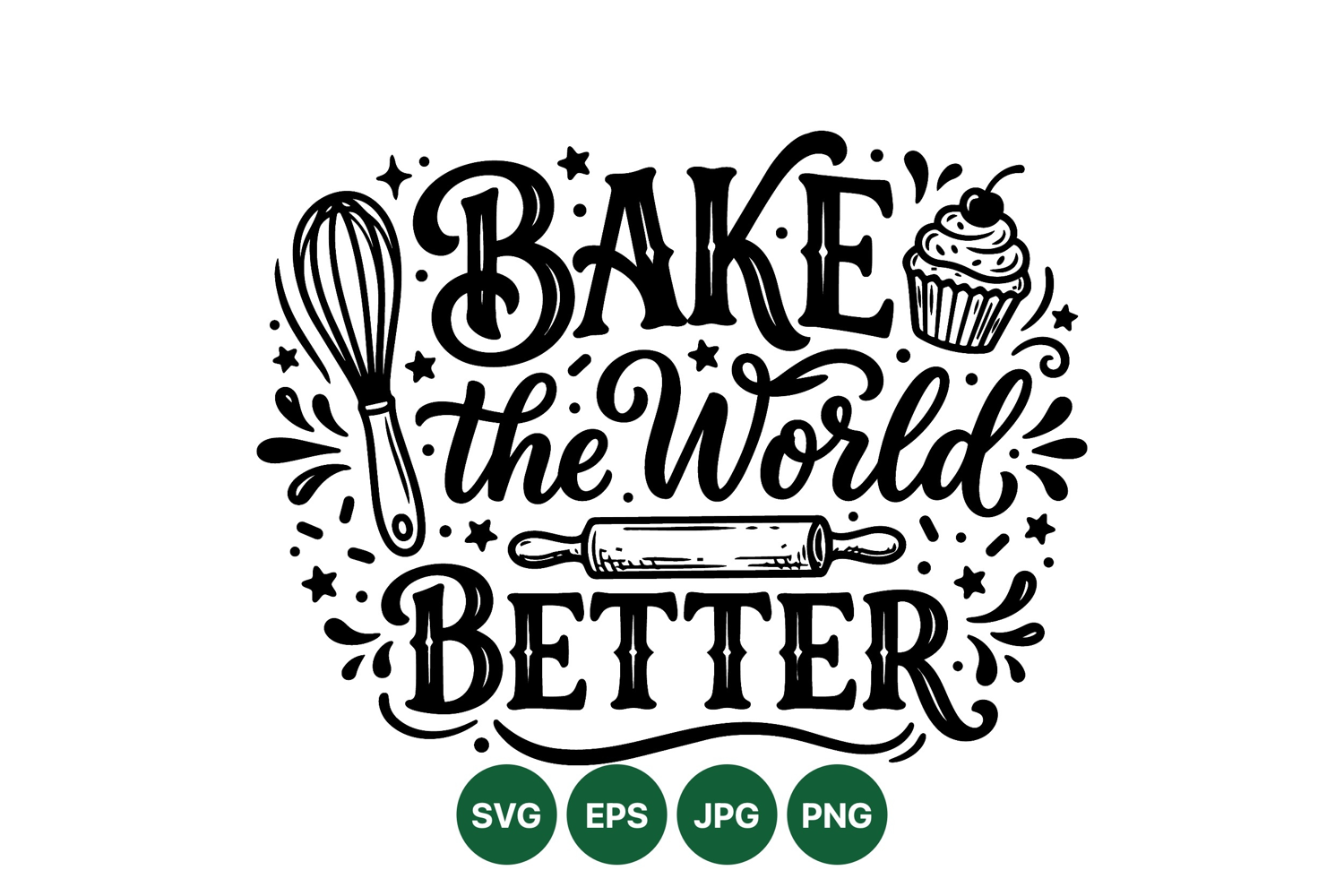 Hand drawn black and white baking quote with whisk rolling pin and cupcake motifs surrounded by decorative stars and splashes in a playful style for kitchen or bakery designs.