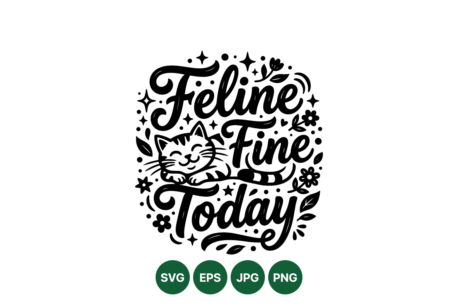 A cheerful cat lies peacefully surrounded by floral details and stars with script style lettering stating feline fine today in monochrome vector art, conveying calm and positivity.
