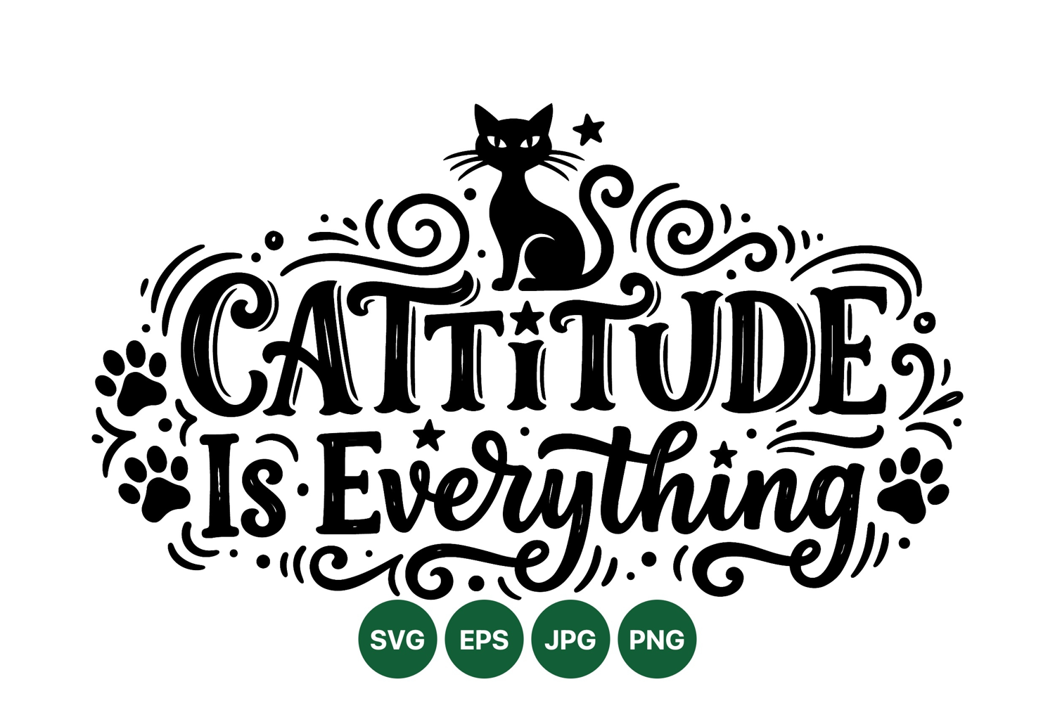 Black and white hand lettering design features a playful cat silhouette above the phrase cattitude is everything with decorative swirls paw prints and stars in a whimsical style