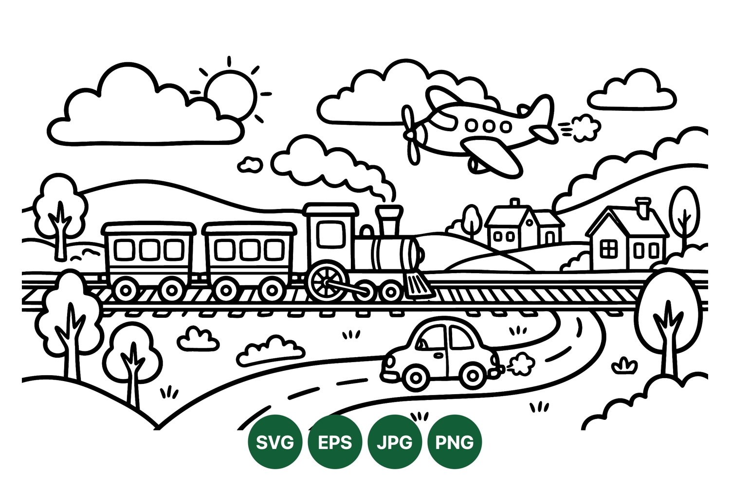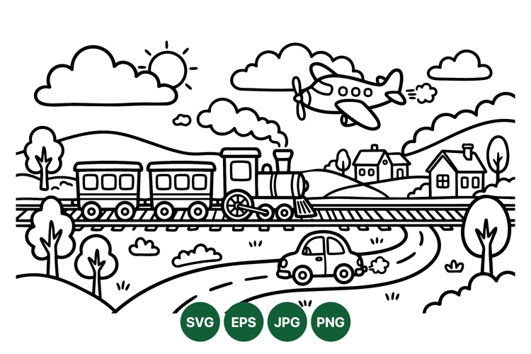 A black and white line drawing depicts a steam locomotive pulling two carriages on railway tracks with a small car on a road and a propeller plane flying above scenic hills and houses peaceful countryside scene