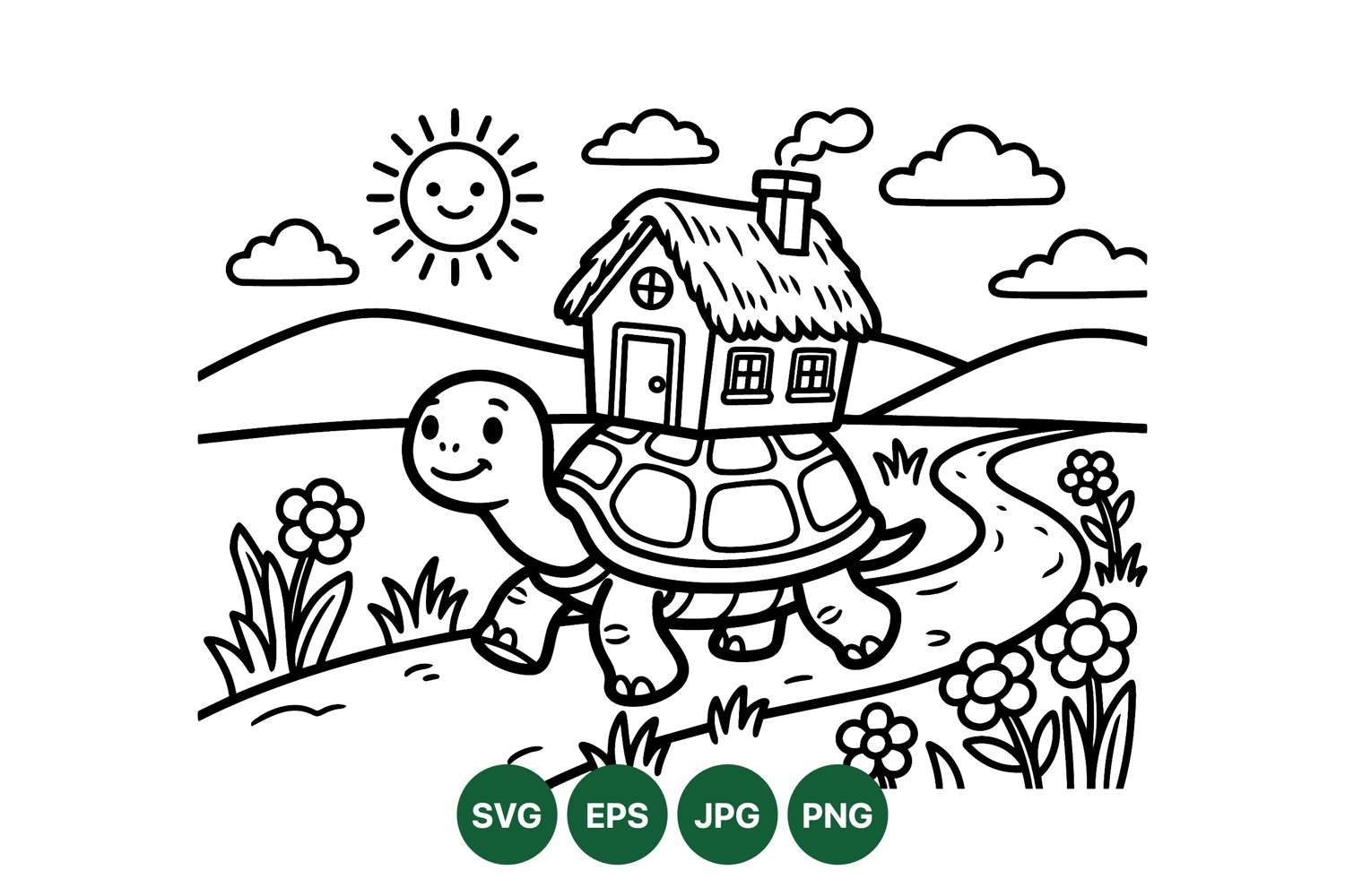 Happy turtle with a cozy house on its back walks along a winding road through a flower filled countryside under a cheerful sun and fluffy clouds peaceful black and white vector drawing