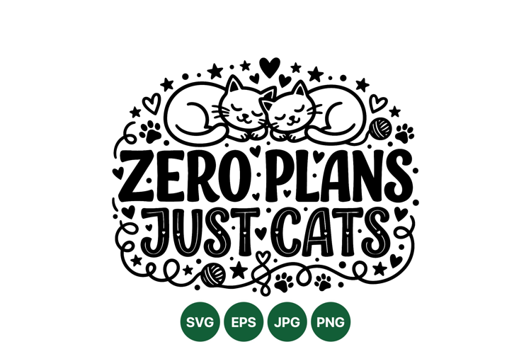 Minimalist black and white vector illustration featuring two peaceful sleeping cats with playful paw prints hearts and stars around zero plans just cats lettering lively cute design