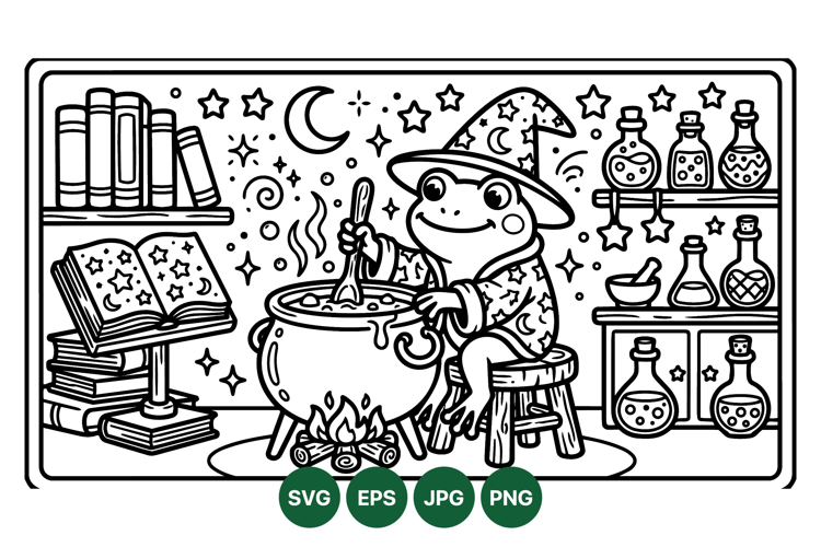 A whimsical doodle style frog wizard wearing a star patterned robe and hat stirs a bubbling magic potion in a cauldron near shelves with books and potion bottles with stars and moon decorations in a cozy scene