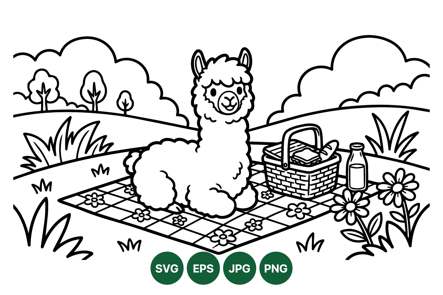 Hand Drawn Llama Picnic Scene Line Art example image 1