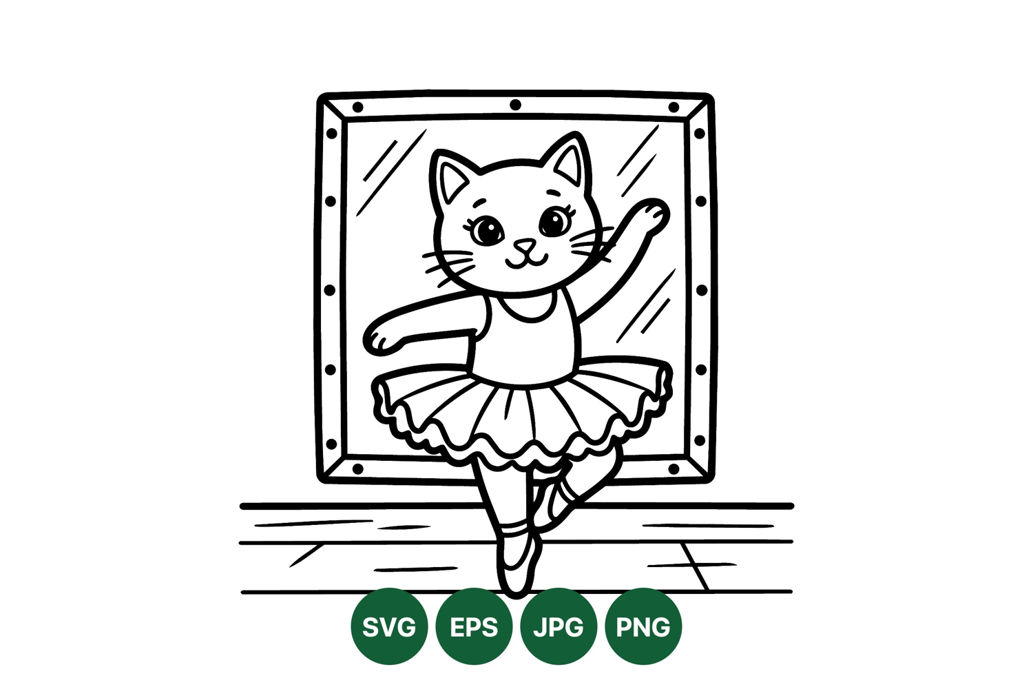 A charming black and white line art of a cat dressed in ballet tutu and shoes dancing gracefully in front of a mirror in a studio environment, playful and artistic.