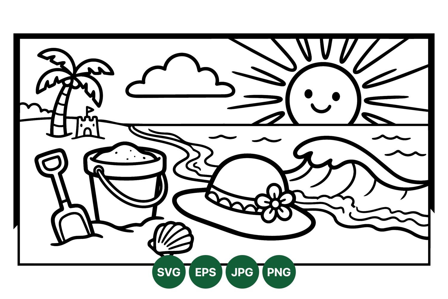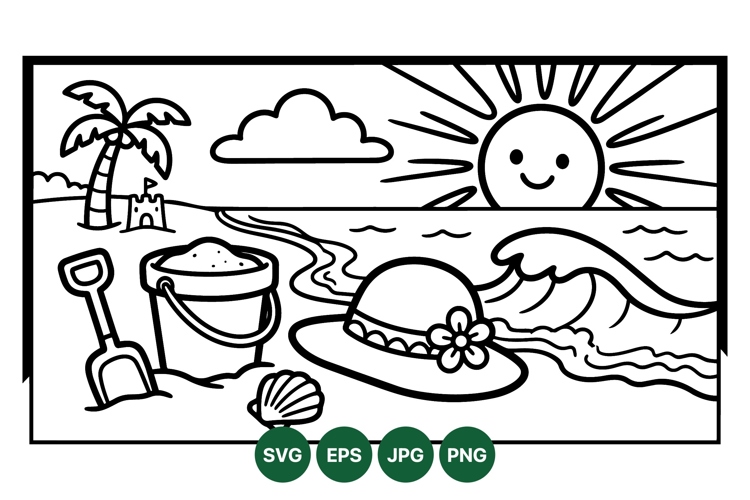 A simple black and white summer beach scene with a smiling sun overhead waves rolling onto shore sand bucket and shovel sun hat shell palm tree and sandcastle peaceful mood