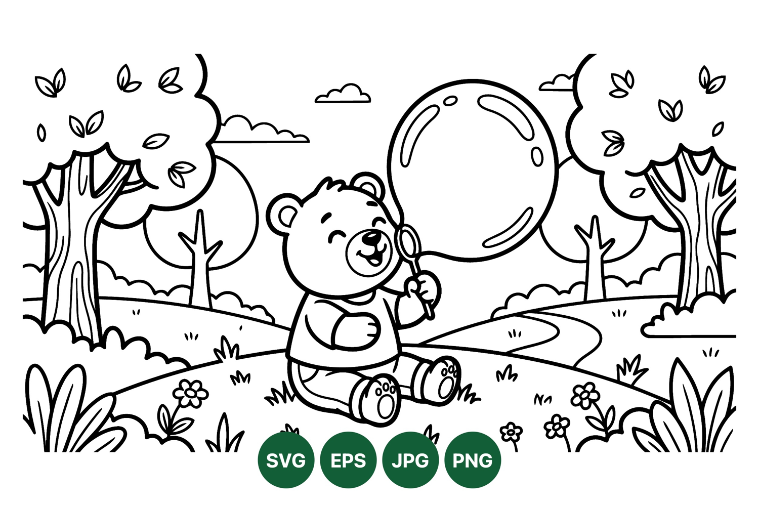 A cheerful bear sits on a grassy hill blowing bubbles with a wand surrounded by trees flowers and clouds in a simple outline cartoon style playful and joyful mood