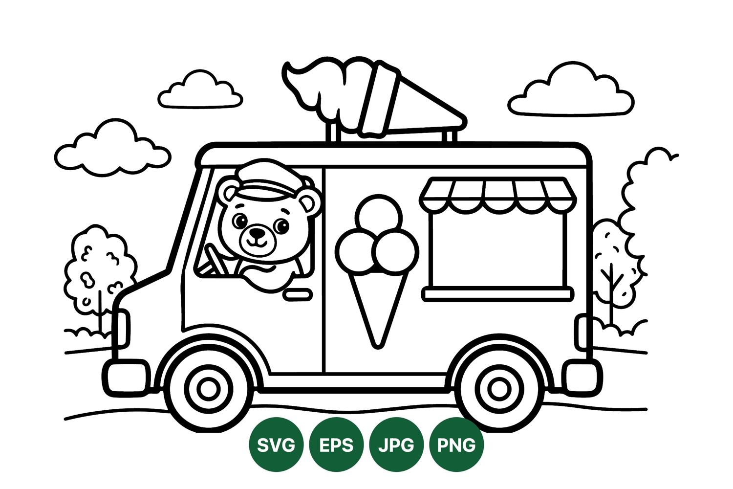 Line Art Clipart Vector Outline Art Kids Coloring Design Child Friendly Illustration Bear Ice Cream Truck Cute Animal Vehicle Ice Cream Dessert Graphic Happy Bear Drawing Summer Food Truck Playful Cartoon Svg