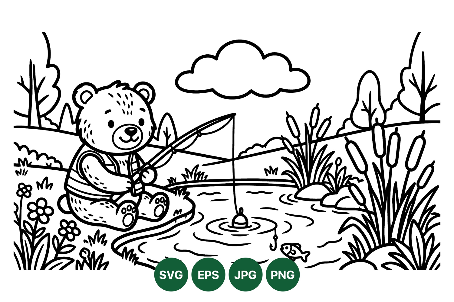 A charming black and white line art vector shows a teddy bear fishing by a river surrounded by natural plants and vegetation, featuring a peaceful and whimsical outdoor scene.