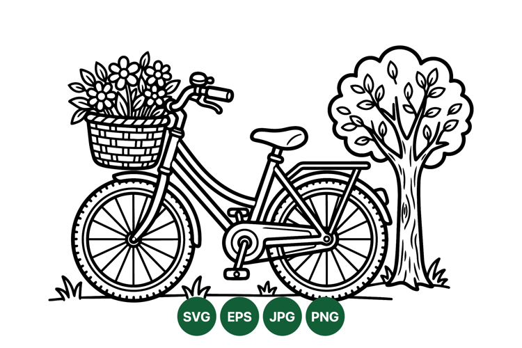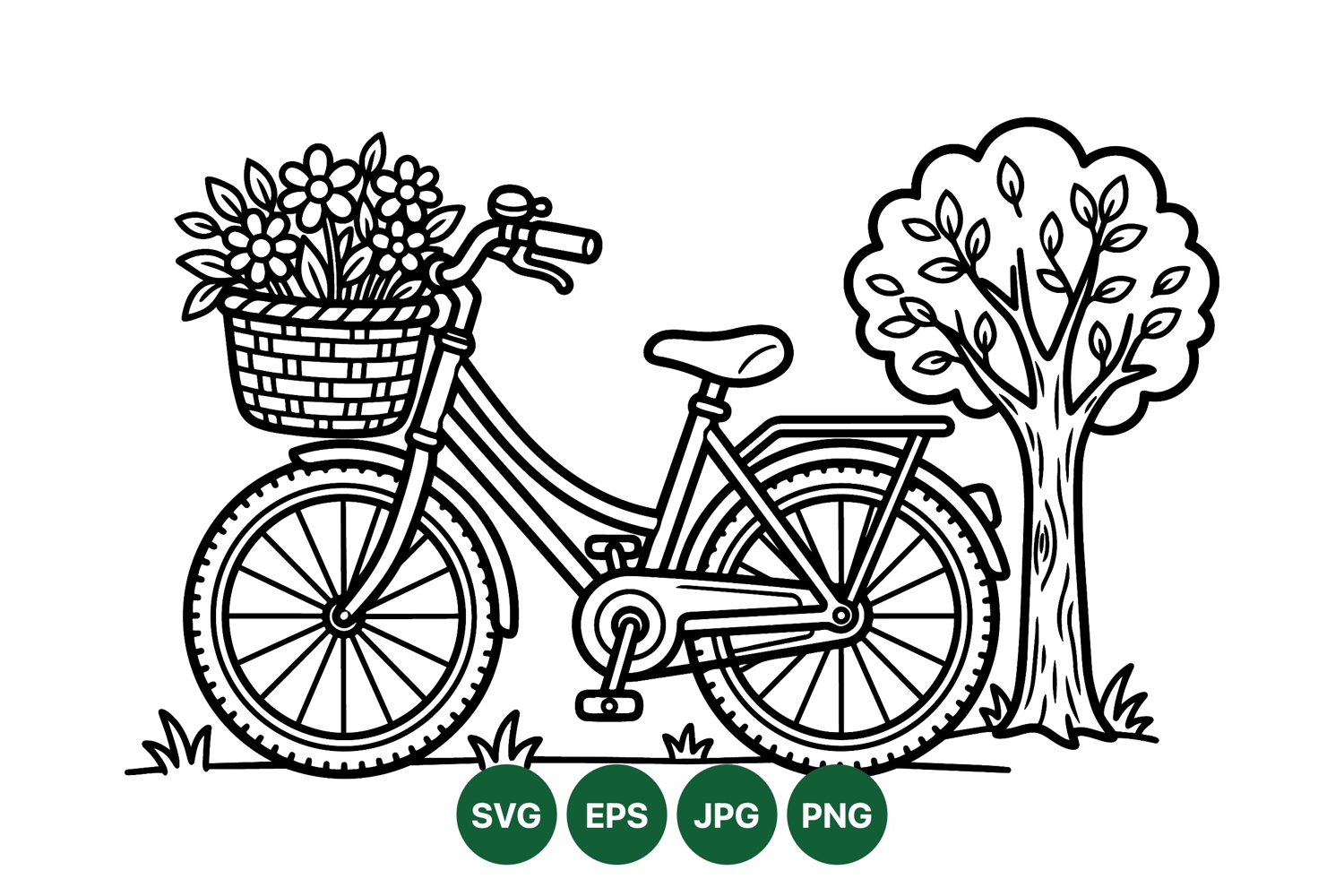 A detailed black and white vector shows a bicycle with a basket full of flowers standing beside a leafy tree on grass a clean and charming line art suitable for coloring peaceful