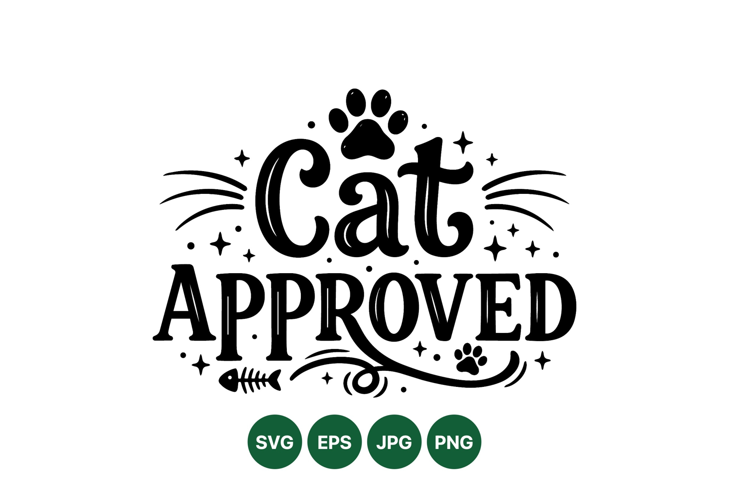 Stylish black and white vector typography featuring the phrase cat approved with paw prints fishbone and whimsical decorative accents in a minimal design suitable for pet lovers