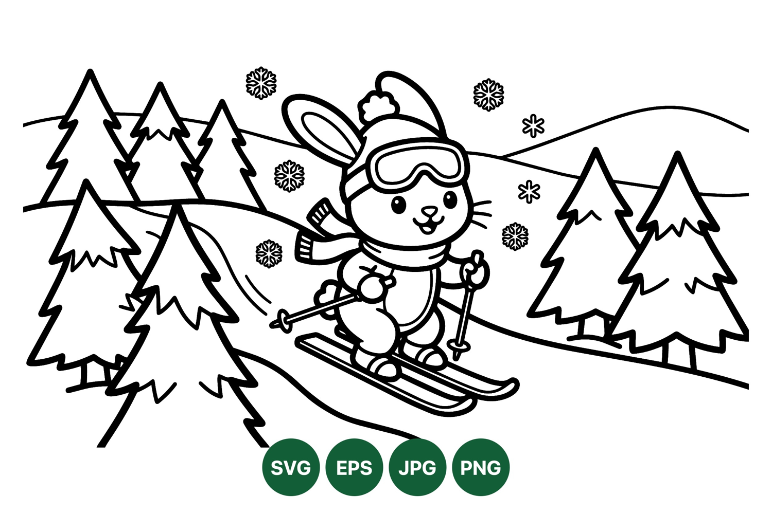 A charming cartoon rabbit skis downhill in winter gear including hat scarf and goggles surrounded by pine trees and snowflakes in a simple black line art style playful and fun