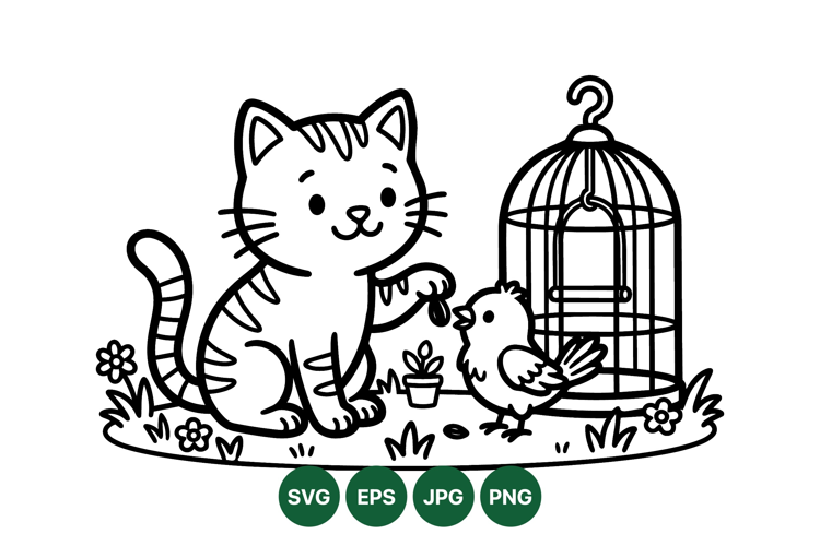 A charming black line art vector shows a smiling cat offering seeds to a small bird beside an open birdcage on grassy ground with flowers creating a playful peaceful scene.