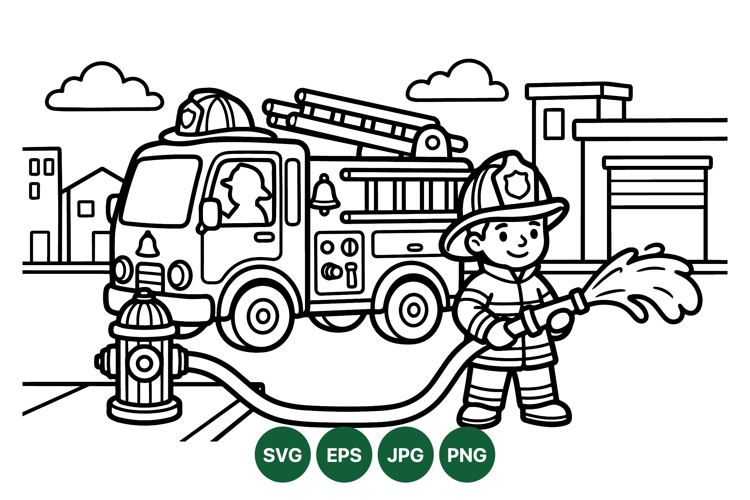 A cheerful firefighter sprays water from a hose connected to a hydrant beside a fire truck with ladder in a town setting line art for coloring page or education