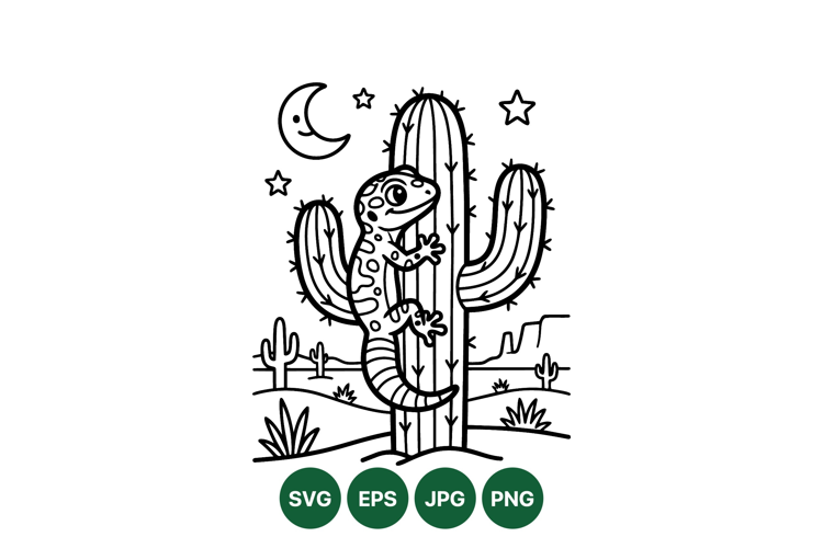 A minimalist black and white vector shows a gecko climbing a tall cactus in a desert at night with moon and stars above, featuring a simple line art style with clear details and playful mood.