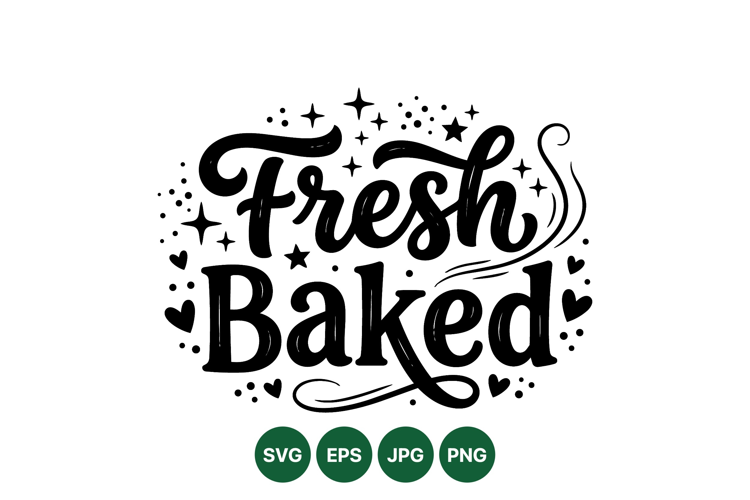 Hand drawn fresh baked text features decorative stars hearts and steam lines creating a charming warm bakery style perfect for food packaging and labels