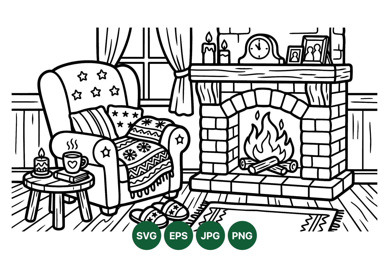 Black and white line art depicts a cozy living room featuring a comfortable armchair near a glowing fireplace warming a peaceful indoor setting with slippers and small table items