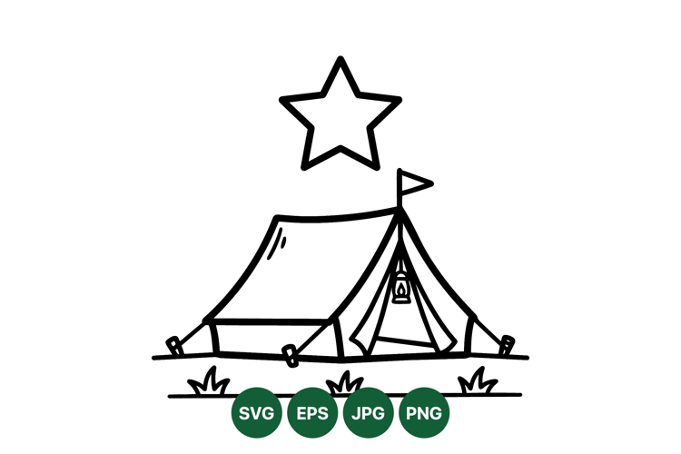 Simple line drawing of a camping tent featuring a hanging lantern inside beneath a star in the night sky with small grass patches outdoors peaceful minimalist style