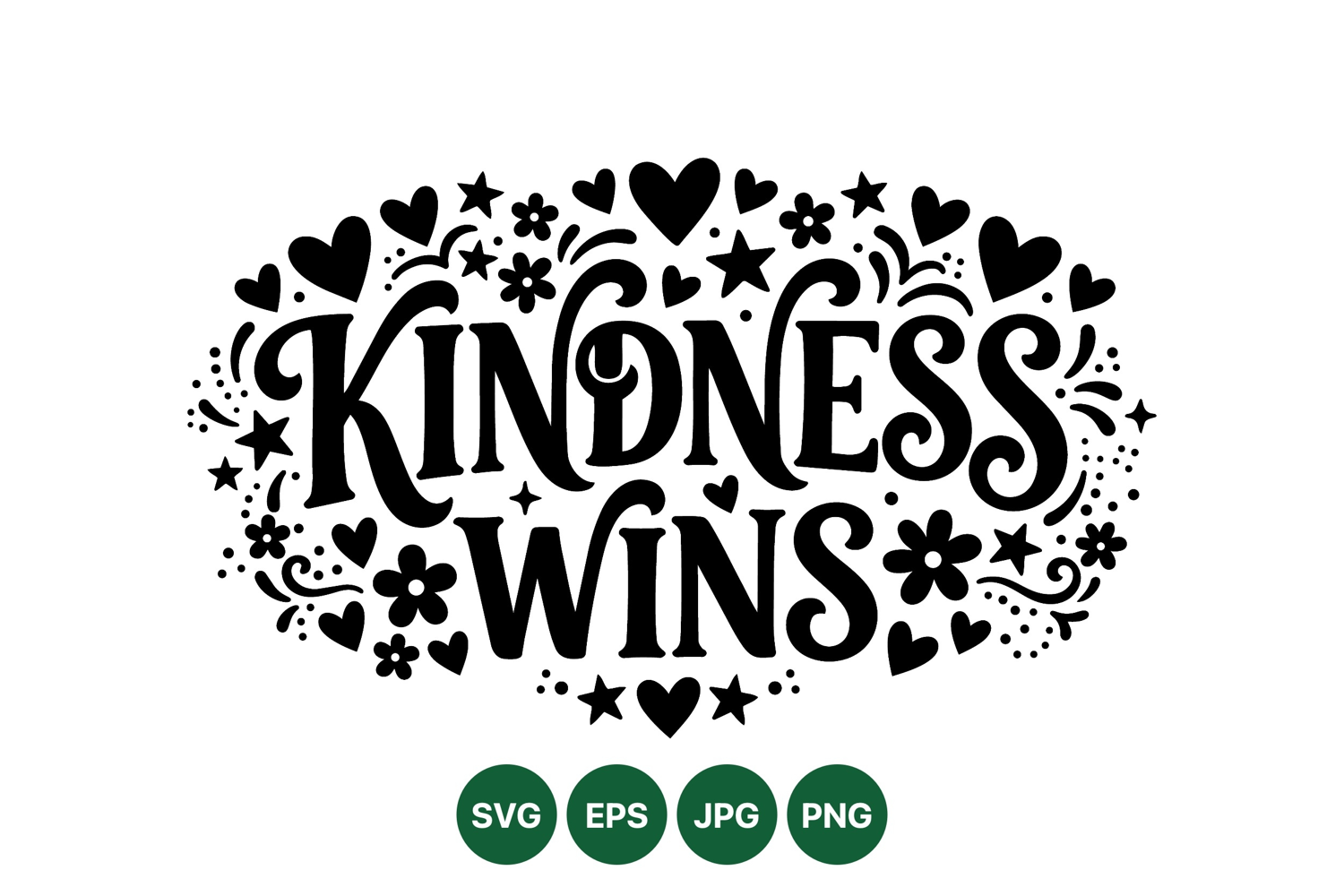 A hand drawn decorative phrase kindness wins is surrounded by hearts stars and flowers in black and white vector art expressing positivity and encouragement in a friendly style