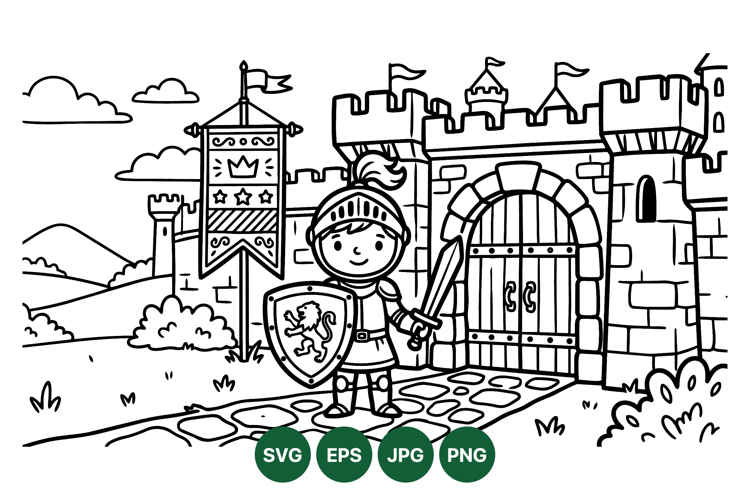 A cheerful young knight stands with sword and lion emblem shield outside a grand castle gate amid a peaceful countryside with hills clouds and bushes in a simple black line art style playful and charming