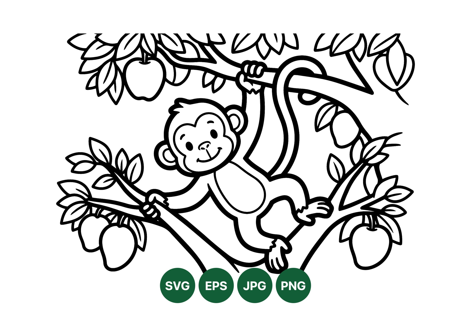 A playful monkey swings happily from tree branches filled with apples and leaves in a clean black and white line art style suitable for coloring or educational materials