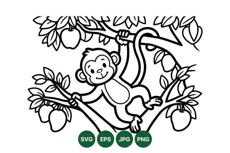 Tree Branch Svg Black And White Svg Jungle Animal Graphic Fruit Tree Drawing Kids Coloring Svg Animal Outline Clipart Childrens Coloring Image Monkey Tree Design Playful Monkey Art Lineart Clipart Design
