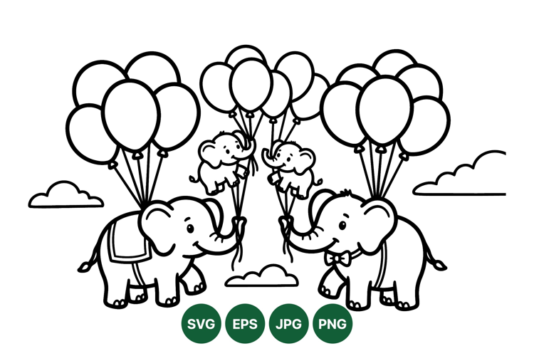 Playful line art depicts adult elephants holding balloons while baby elephants float happily above clouds in a minimalist black and white vector drawing, charming and cheerful.