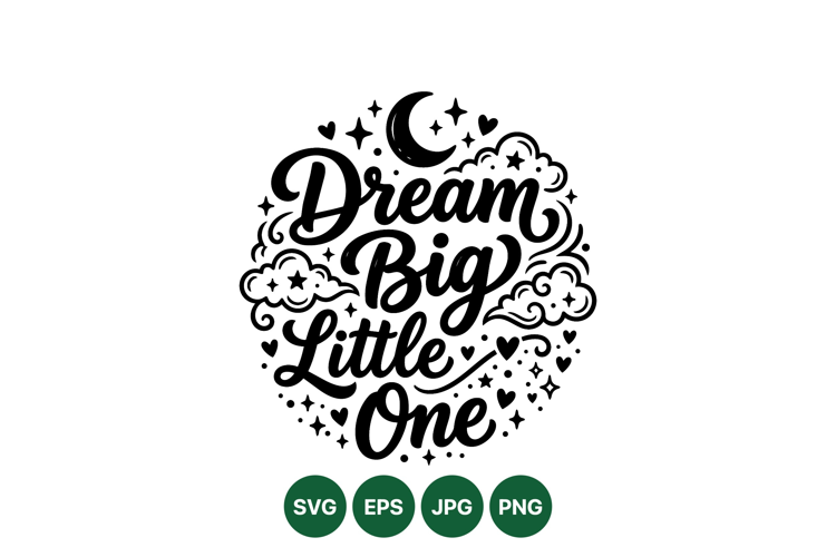 Decorative hand lettering showcases the phrase dream big little one with surrounding stars moon hearts and swirling clouds in a clean black and white style suitable for nursery decor or gifts