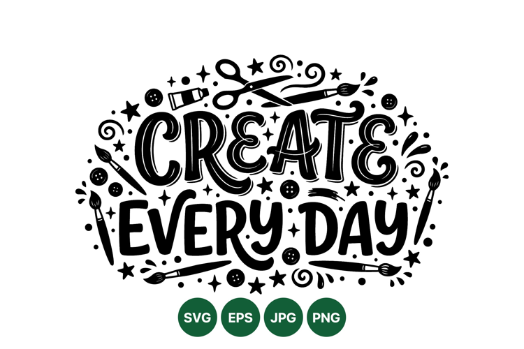 A monochrome hand lettered phrase create every day surrounded by paintbrushes scissors and stars in a playful artistic style vector graphic suitable for creative projects bold and inspiring