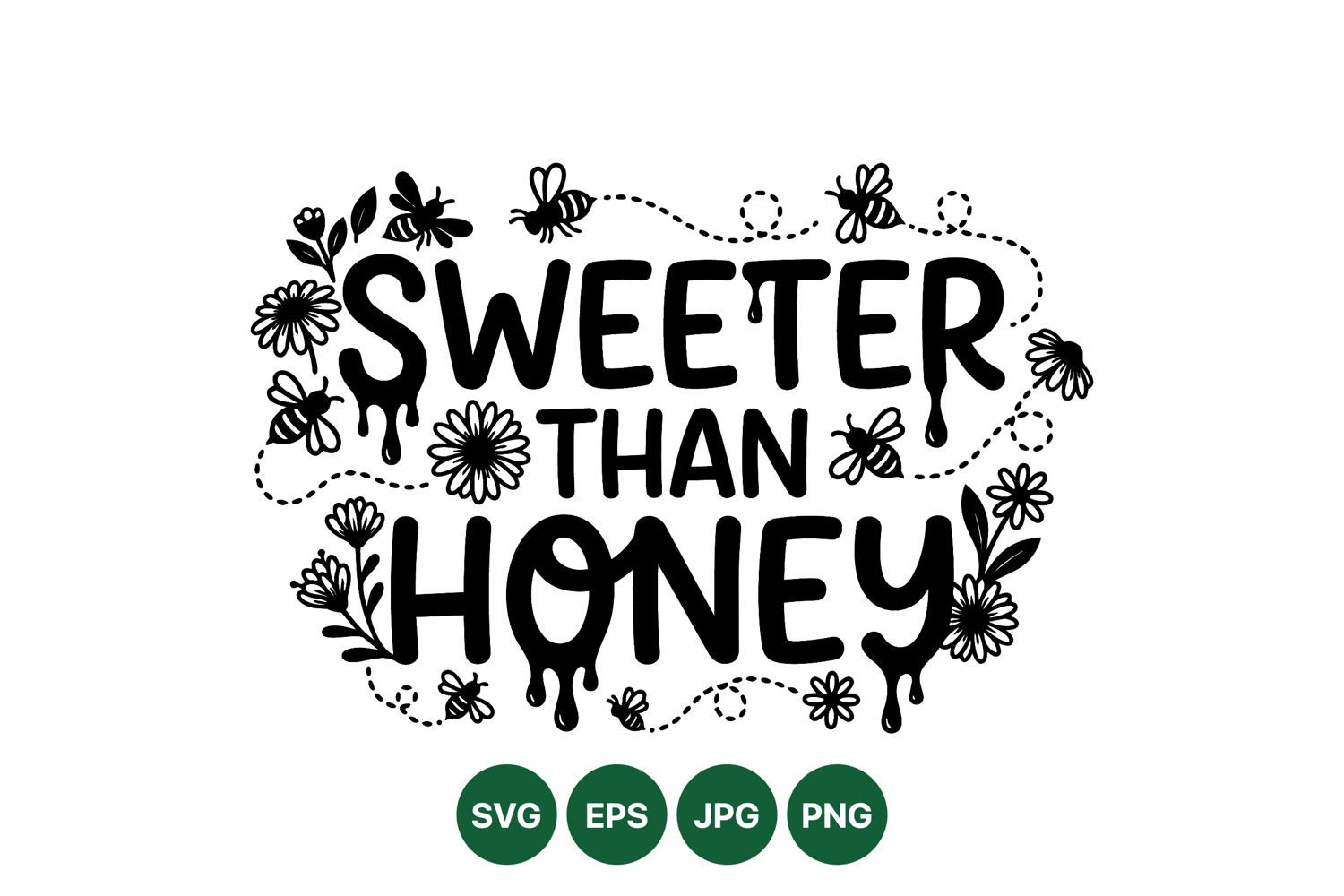 Hand drawn lettering saying sweeter than honey with dripping effects and multiple bees flying around flowers creating a charming and natural vector design illustration.