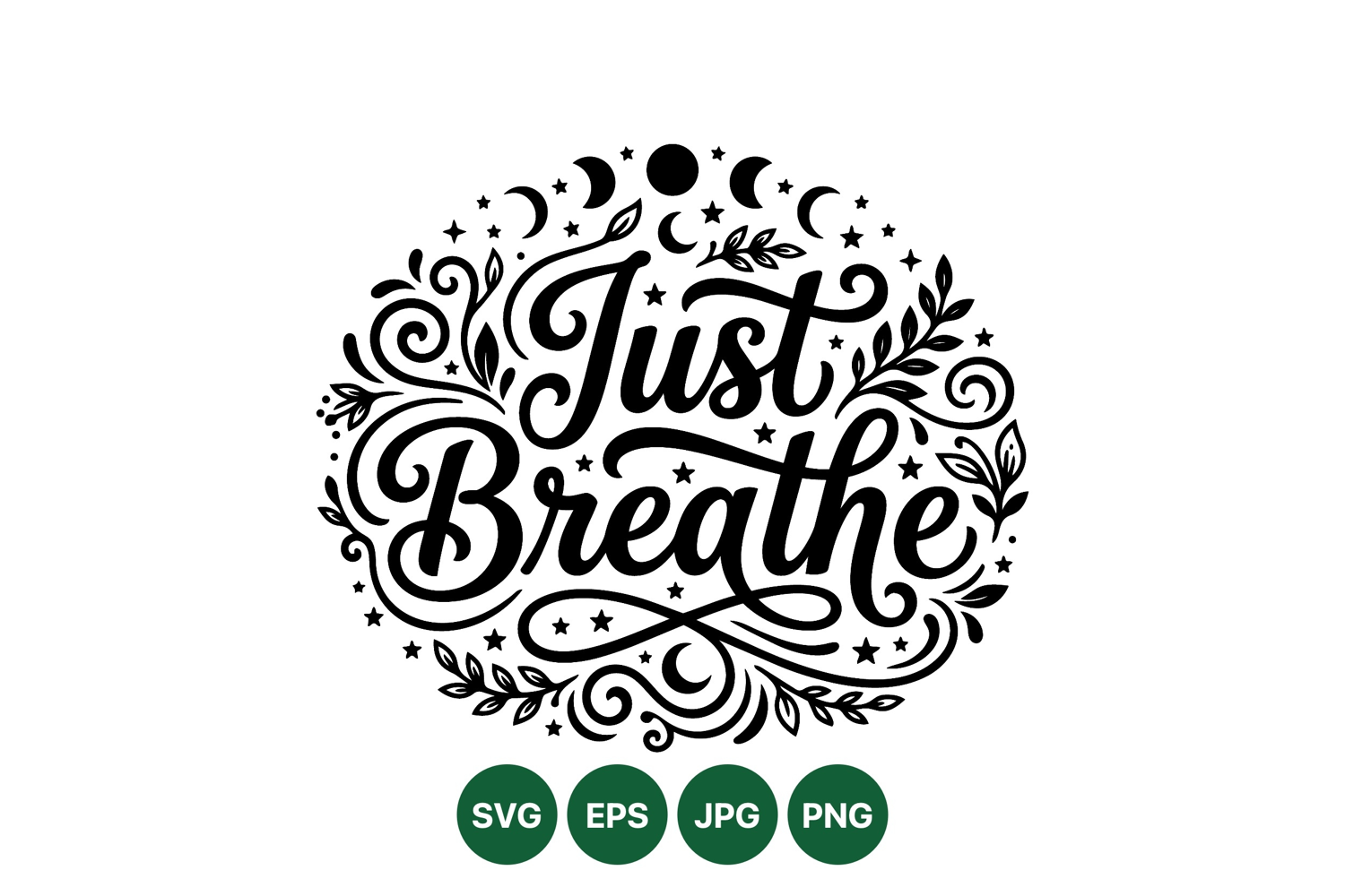Elegant black calligraphy saying just breathe surrounded by swirling leaves stars and moon shapes in a circular composition vector art with calming peaceful mood