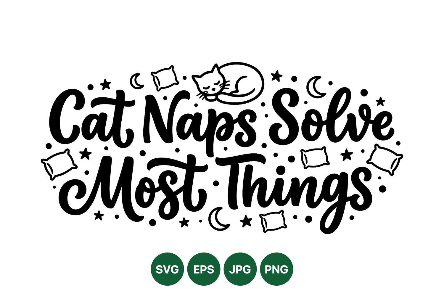 Hand lettering design states cat naps solve most things surrounded by a sleeping cat moon stars and pillows in simple black vector illustration style peaceful and calming mood