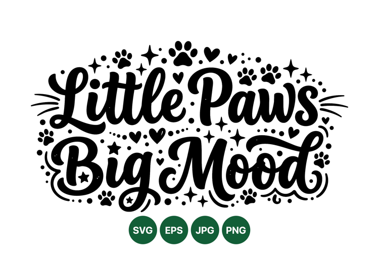 Elegant hand lettering design displaying the phrase little paws big mood surrounded by paw prints hearts stars and dots perfect for pet themed projects friendly uplifting style