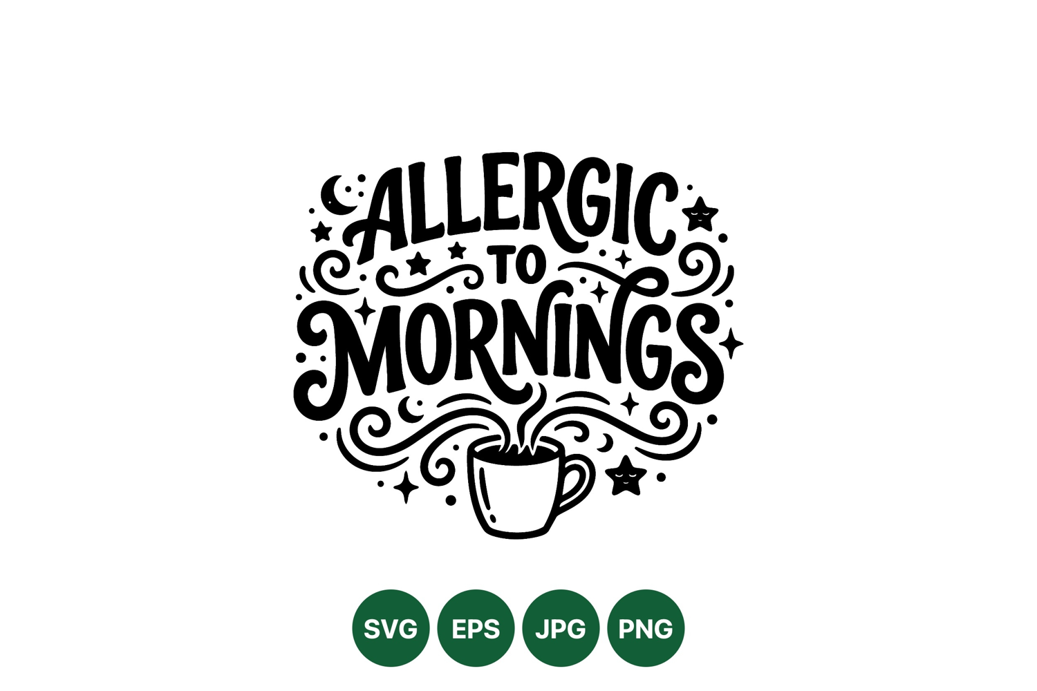Hand drawn typography artwork featuring the phrase allergic to mornings with a steaming coffee cup and whimsical decorative stars and swirls in black and white vector style