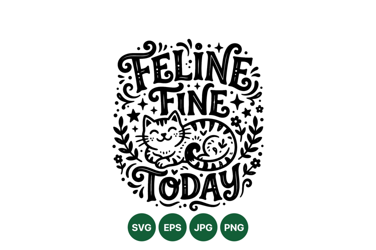 A charming black and white vector art shows a happy curled cat with playful hand lettering saying feline fine today surrounded by whimsical flowers and stars in a decorative style