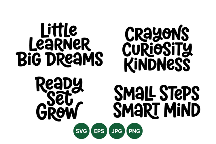 A of hand lettered inspirational text phrases including little learner big dreams crayons curiosity kindness small steps and smart mind in bold black font design.