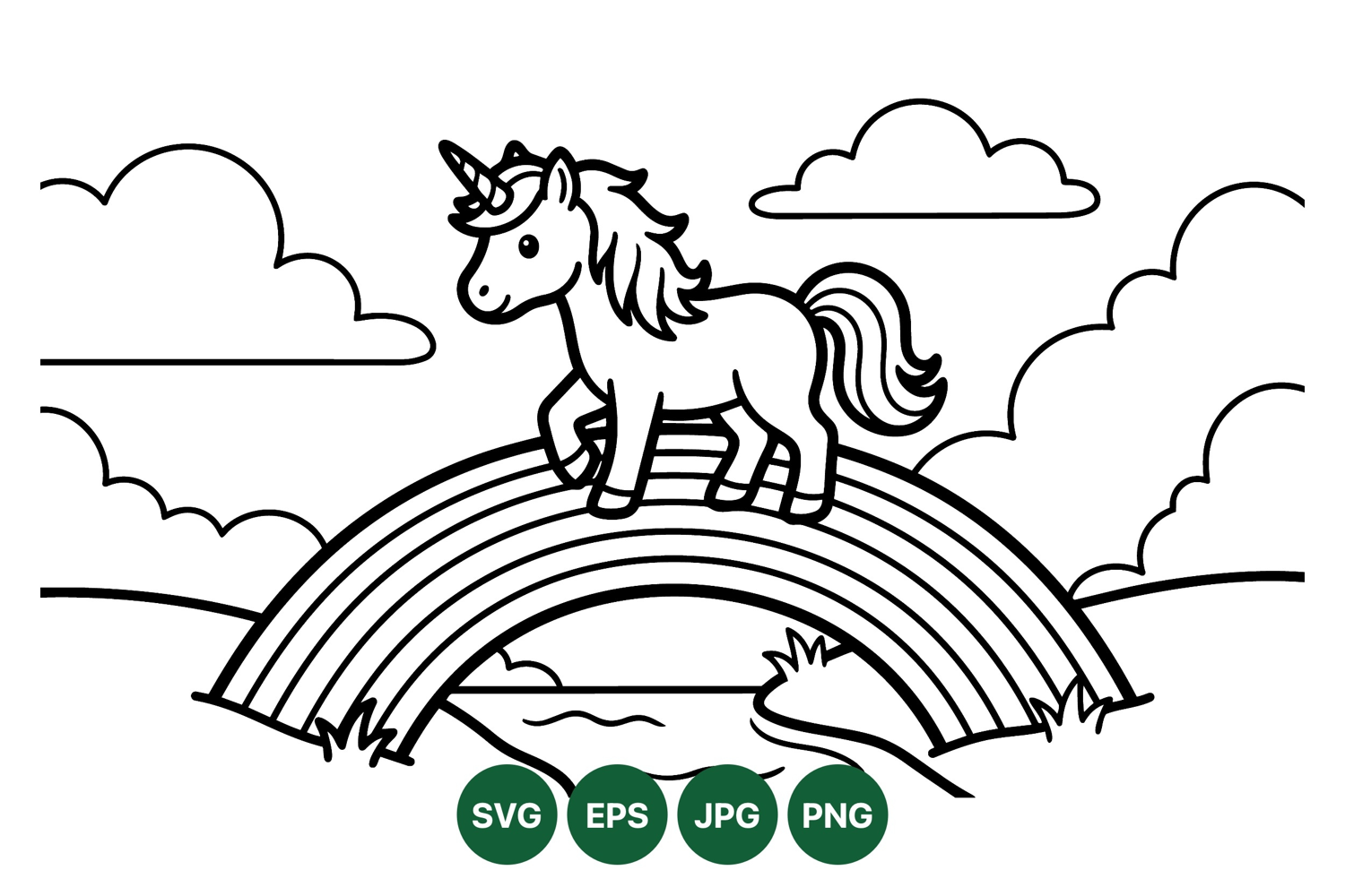 A charming unicorn stands walking on a curved rainbow over a small river with fluffy clouds in a clean black line art style vector illustration for kids coloring and design projects cheerful