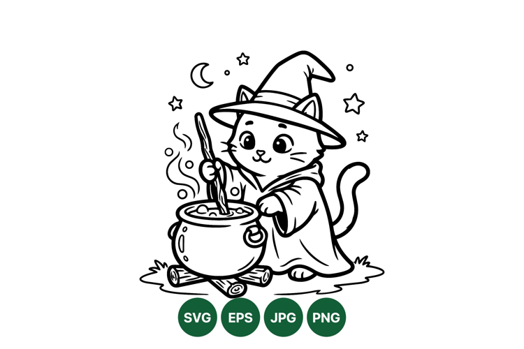 A charming cat dressed as a wizard stirs a bubbling cauldron under a crescent moon and stars in a line art style ideal for halloween and fantasy designs with a playful mood