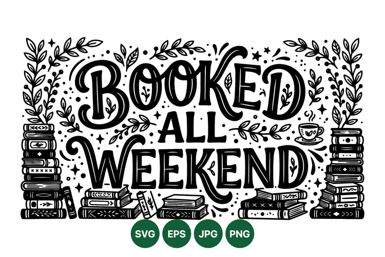 A hand drawn ink calligraphy design reads booked all weekend surrounded by vintage style stacks of books leaves and small stars creating a cozy mood