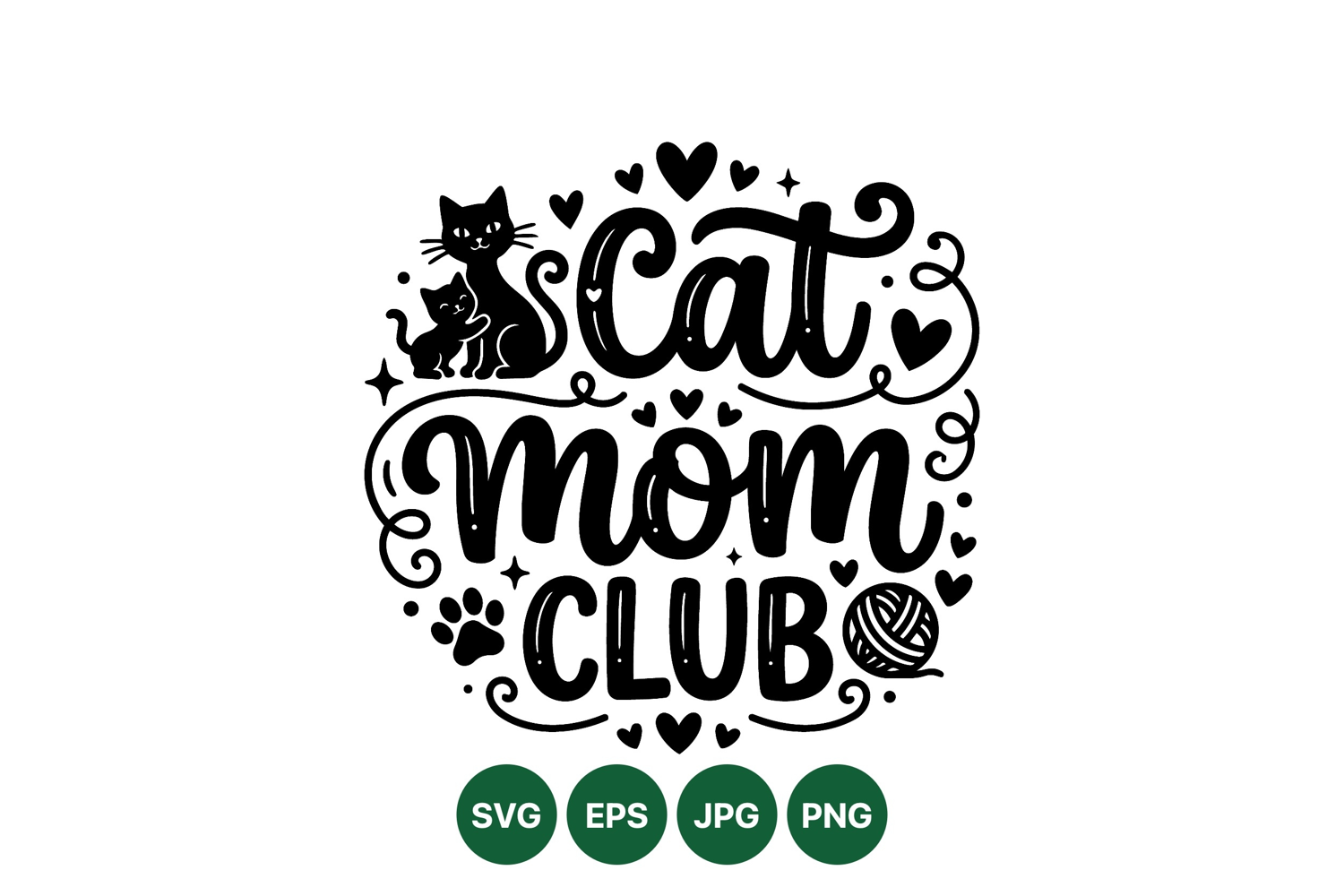 Cute black silhouettes of a cat and kitten accompany hand lettered phrase cat mom club surrounded by hearts yarn ball and paw print in a charming vector style