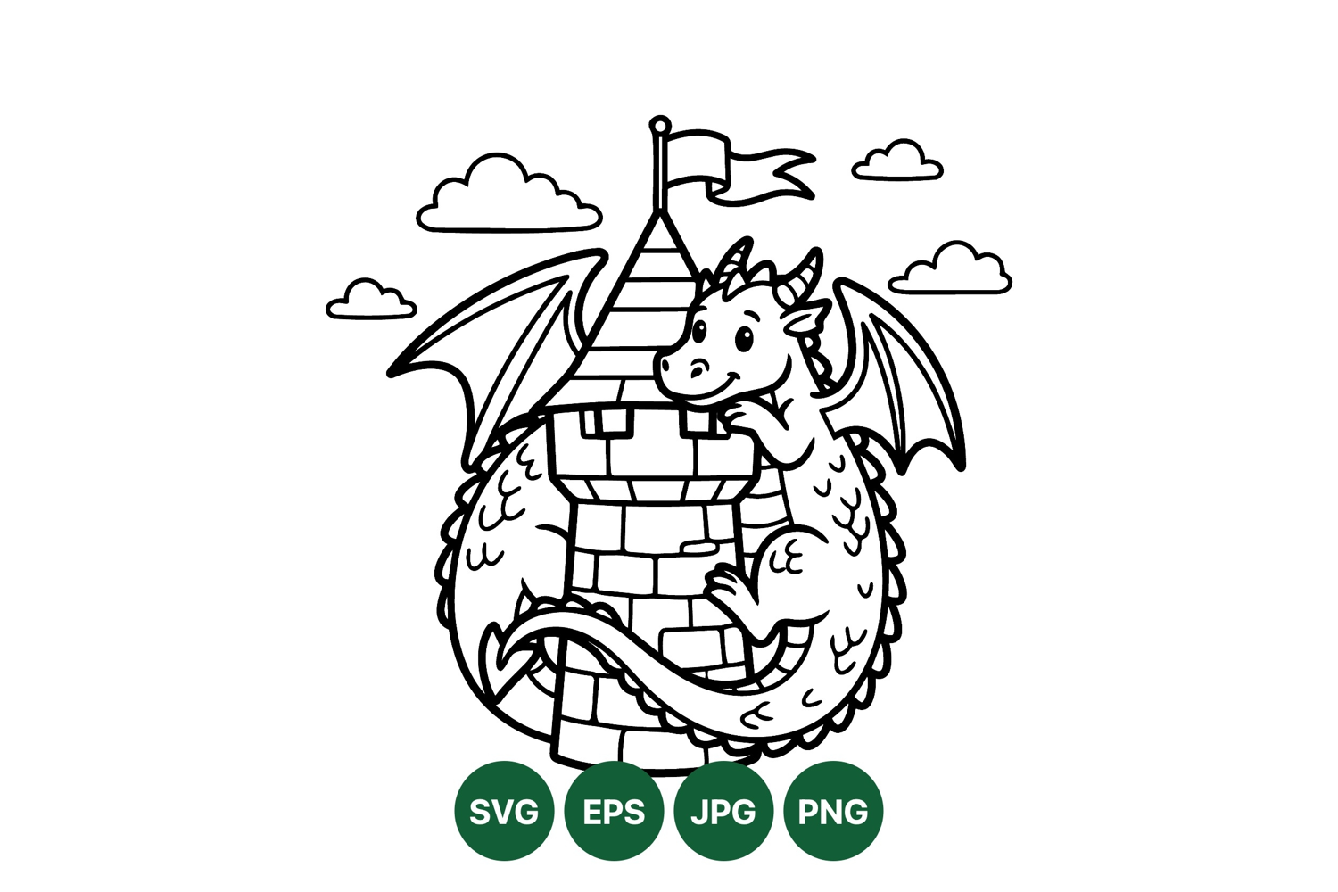 A charming cartoon dragon wraps around a stone castle tower topped with a waving flag and surrounded by soft clouds in black and white line art style playful and whimsical