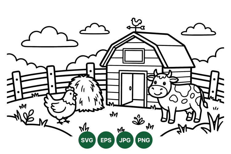 A peaceful farmyard scene in black and white line art shows a happy cow standing by a chicken and haystack near a wooden barn with a weather vane and fenced surroundings in calm daylight